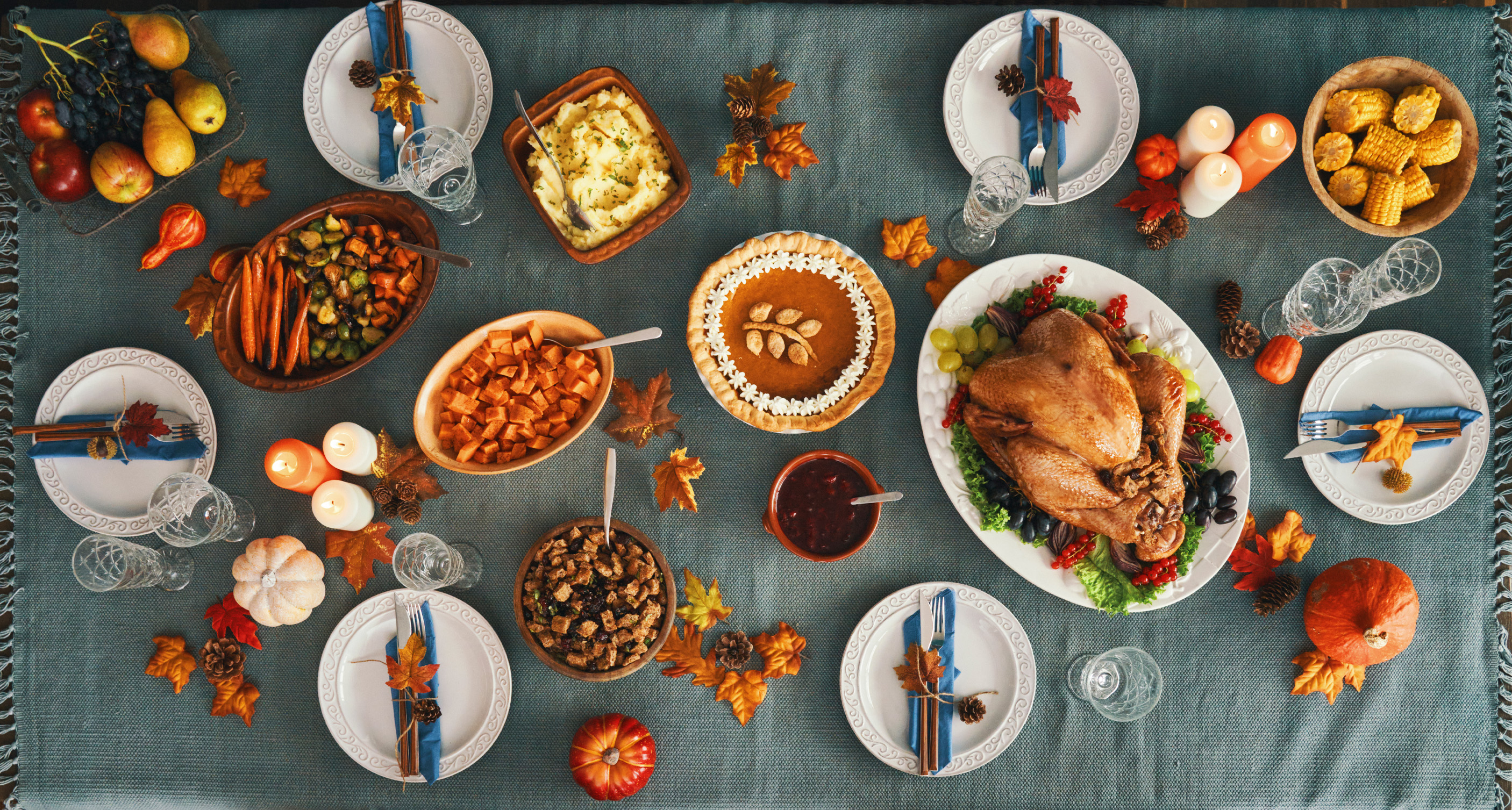 Thyme Roasted Turkey | Cranberry Sauce | Honey Glazed Salmon | Classic Cornbread Stuffing | Brown Butter Mashed Potato | Green Beans Almandine | Roasted Fall Vegetables | Pecan Pie | Cheesecake with Caramel Sauce | Dinner Rolls with Butter | Coffee & Hot Tea | Hot Apple Cider